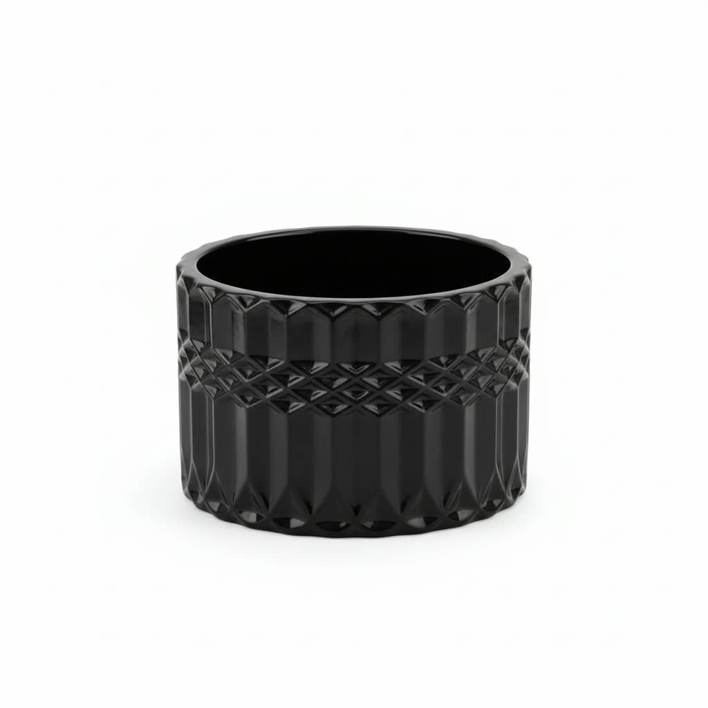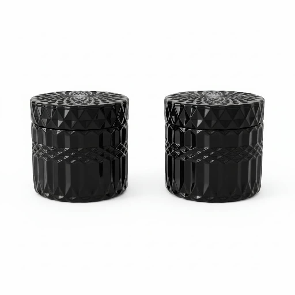 Selgelt esile toodud cut glass muster mängib valgusega, samas kui sügav must toon toob kaunilt esile sildid, logod ja metallilised detailid. Tugev kaas lisab praktilisust ja esteetikat — ideaalne nii kingitusteks kui ka professionaalseteks küünlasarjadeks.